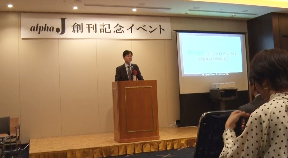 英語教育に関わる人々を中心とする多彩なゲストが参加する中、イベントは株式会社ジャパンタイムズ出版の伊藤秀樹取締役社長のスピーチで幕を開けた。「Alpha Jには、70年以上にわたりニュースを題材にした英語学習紙を発行し続けてきた経験と、ここ何年かで蓄積したオンラインコンテンツを通じた英語学習を提供するノウハウが詰まっている」と伊藤社長は「Alpha J」をこう紹介した。
